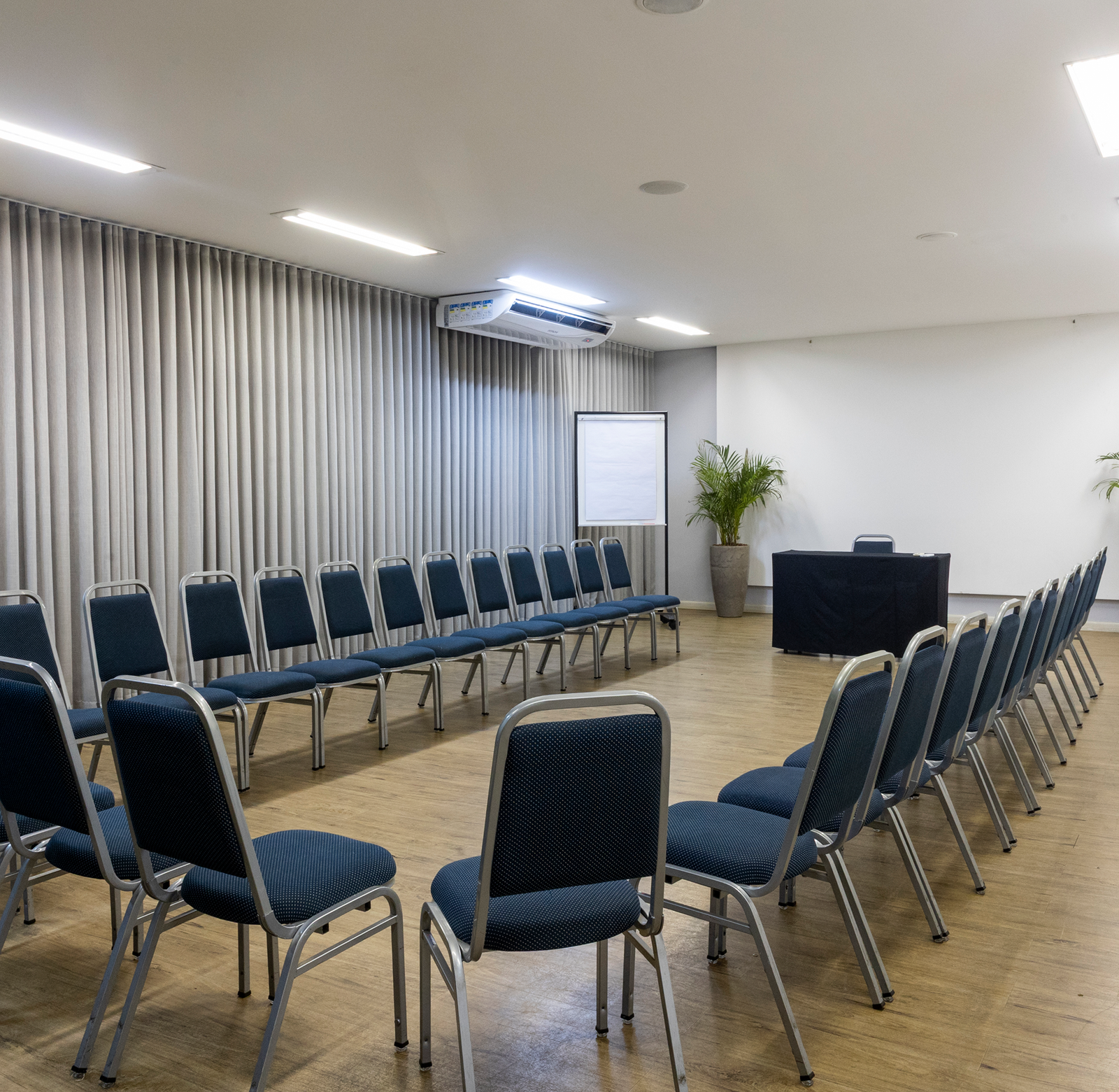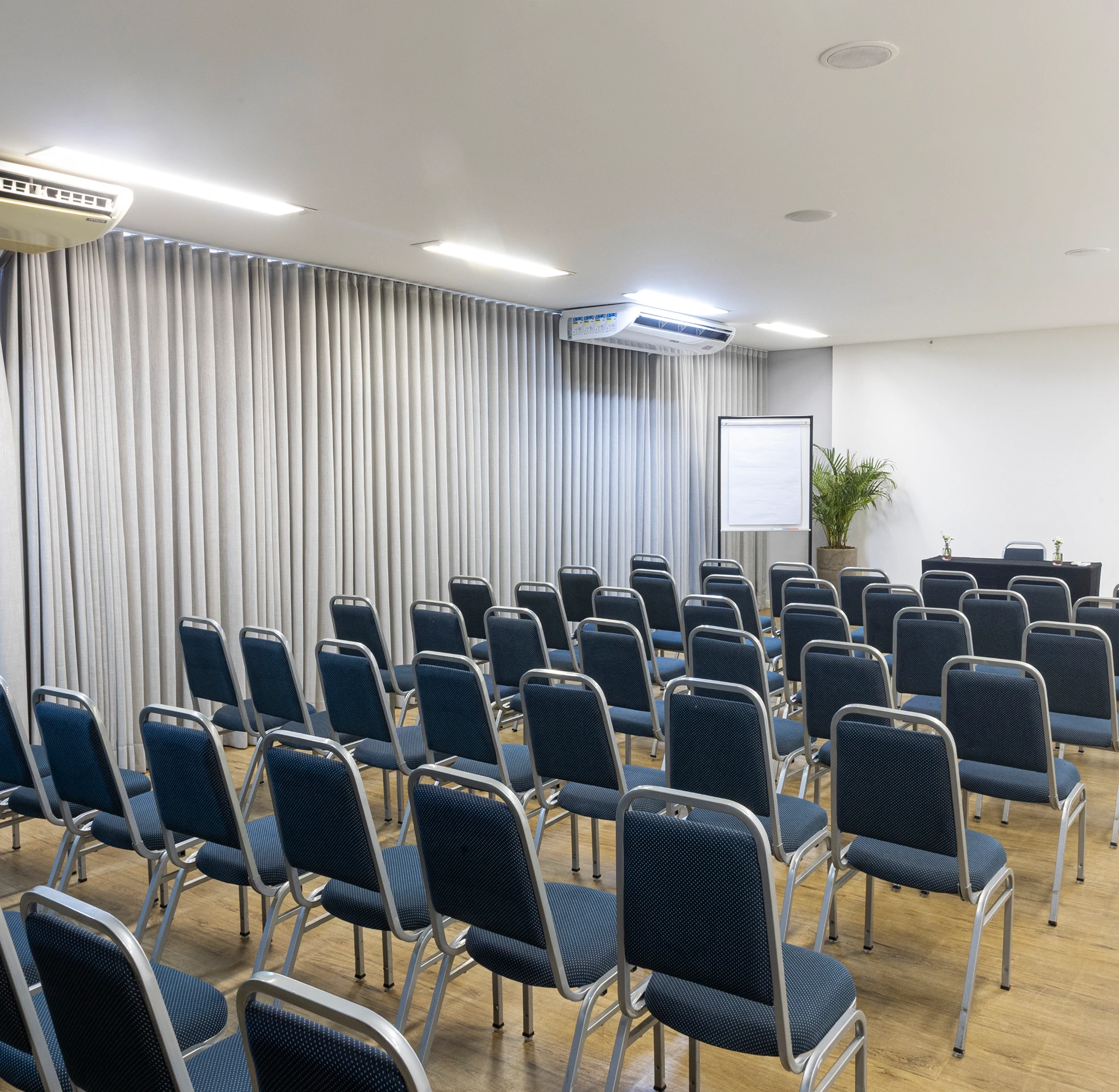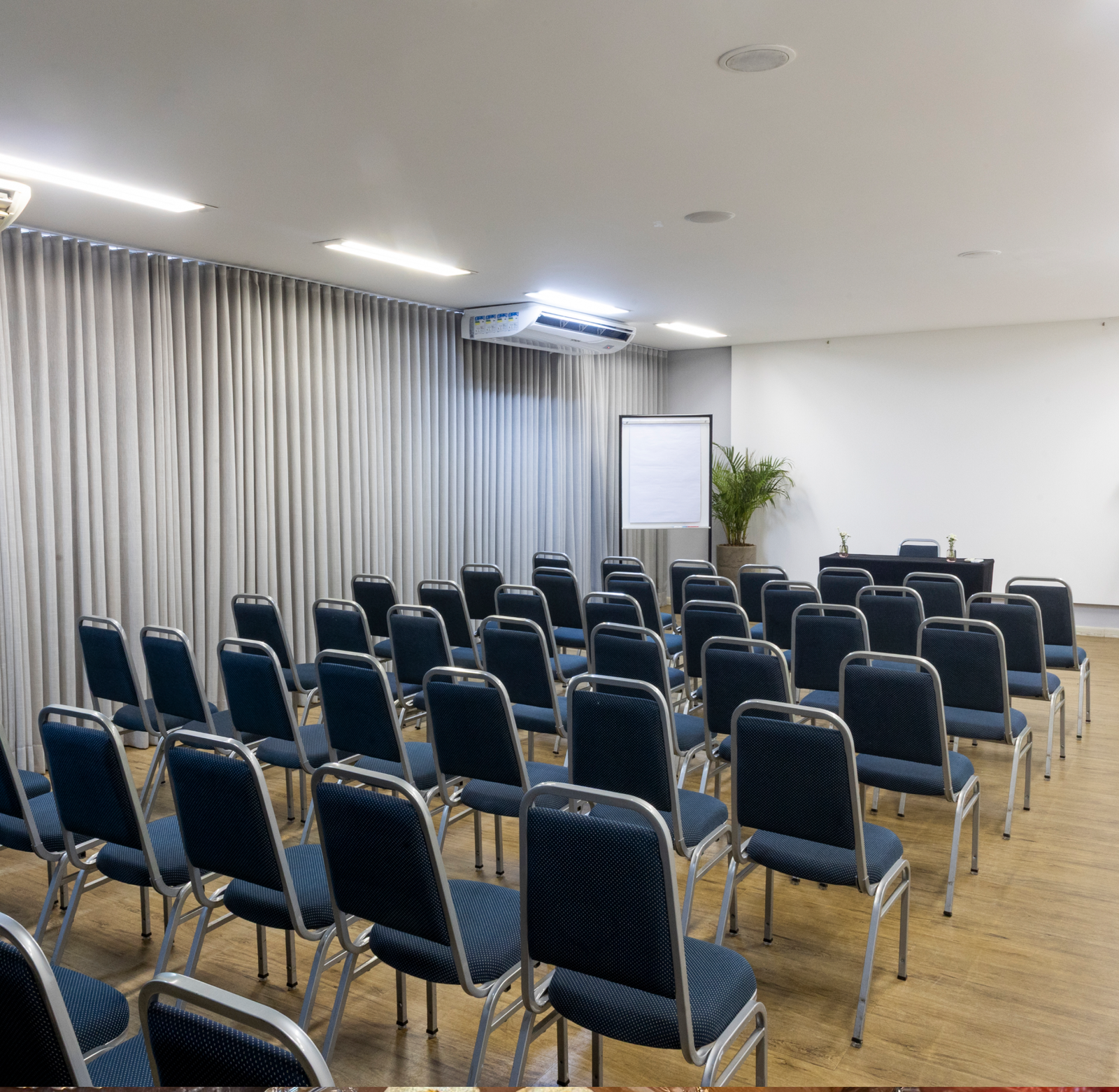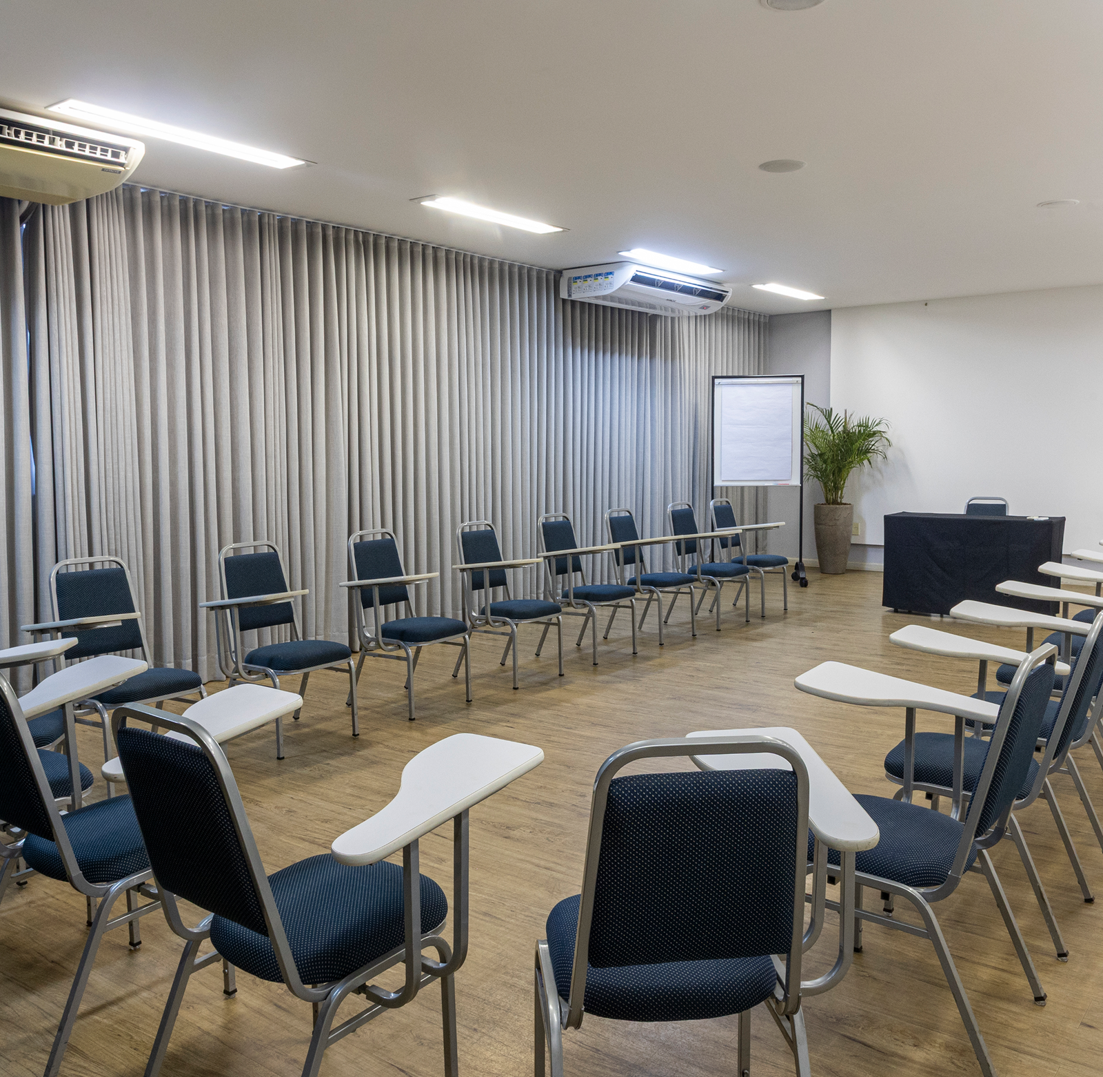 Sala ampla, com excelente acústica, além de contar com iluminação natural e artificial. Ideal para treinamentos, workshops, palestras e reuniões ampliadas.