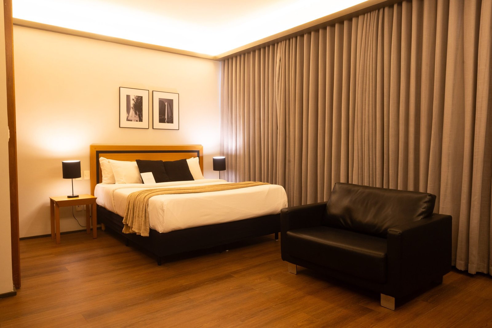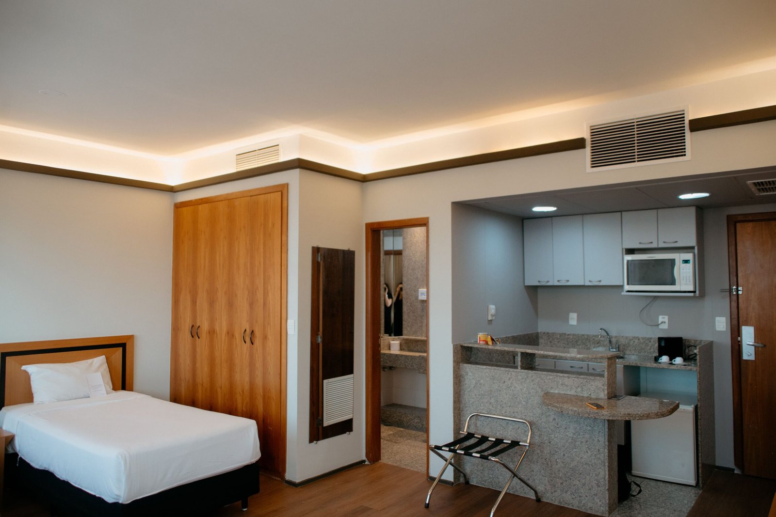 Apartamentos amplos, com ambientes integrados (quarto + lounge + cozinha).